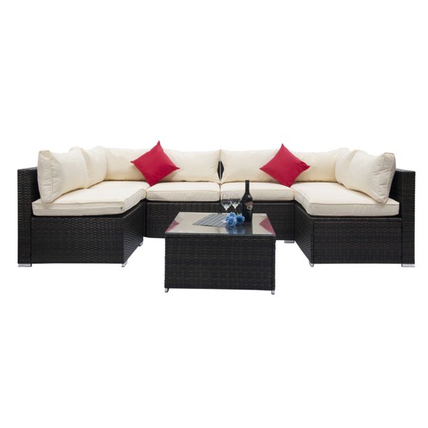 Xgeek Outdoor Patio Furniture 7 Pieces Patio Furniture Wicker Sofa Set Sectional Seating Group With Washable Seat Cushions And Modern Glass Coffee Table Beige Cushion Walmart Com Walmart Com